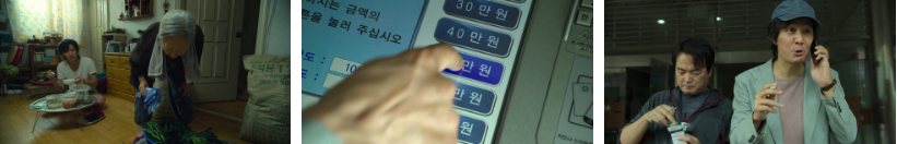그렇게 기훈은 생각과는 달리 형편없는 딸생일을 보내고, 집으로 돌아오는 지하철역 의자에 앉아 있는데, 깔끔한 양복 차림의 007가방을 든 남자(공유 까메오 ㅋ)가 말을 걸어요. 내기 한 번 하자고. 다짜고짜 뭔 내기냐고 하는 기훈한테.. 빨강, 파랑 딱지를 보여주면서.. 딱지치기를 해서 기훈씨가 지면 따귀 한 대를 맞고 이기면 10만원을 주겠다고...모아니면 도라는 기분으로 기훈은 오케이 하고. 처음 몇 번.. 볼이 벌겋게 되도록 정신없게 따귀만 맞다가 .. 드디어 기훈이 내리치는 딱지에 공유 딱지 뒤집어지고..ㅋ 공유 따귀를 대차게 치려는 순간 기훈손에 10만원을 쥐어줍니다.... 그렇게 멍하게 10만원을 쳐다보고...다음 화면에.. 기훈이.. 만원짜리와 5만원짜리를 두툼하게 들고 세고있죠 ㅎ 볼은 더 벌게져가지고 ㅋㅋ 돈을 세고 있는 기훈 옆에서.. 공유가 하는 말이...이런 게임 몇 번을 하면 큰 돈을 벌 수 있는데 해보지 않겠냐고 해요. " 이거 신종피라미드 그런거냐고 사람 잘 못 봤다고 자기는 그렇게 어리숙한 사람 아니라고~" 하는 기훈한테 공유는 ..기훈의 나이, 이름, 학벌부터 시작해서 처한 상황을 줄줄 읊어대고...놀라면서 당신이 뭔데 내 뒷조사를 했냐는 기훈 말에 공유는 번호가 적힌 명함 한 장을 주며.. 자리 얼마 안남았으니 전화하라고 하고 가버리죠.