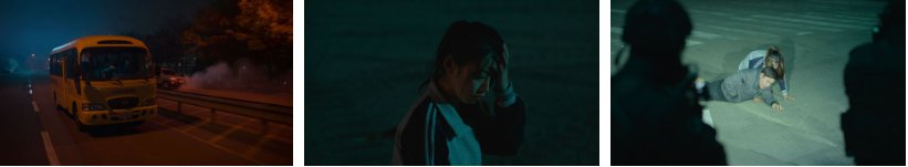 해가 진 어두운 거리를 유치원 셔틀버스가 달리고 있습니다. 후배경찰이 운전하고.. 세빈이라는 이름의 4살 여자아이와 유투버가 앉아있는 의자 옆에서 재익이 갓난아이를 안고 얼르고 있다가 고개를 들어 운전석을 보며 넌 나중에 자기한테 죽었다 합니다 ㅎ 그래서 더 안전하고 튼튼한 버스를 몰고 다시 갔지 않았냐고 느물거리는 후배가 텅~ 하는 소리와 함께 급브레이크를 밟습니다. 잠깐 정적이 흐른 버스 안.. 재익은 아기를 유투버한테 건네준 후.. 얼어있는 후배한테.. 너 또 배신해서 자기가 좀비되면 너만 쫓아다니면서 기어코 너도 좀비 만들어 버린다고 으름장을 놓고는 버스에서 내려 다가가니 은지가 쓰러져 있습니다. 엎어져 있던 은지가 아무렇지 않게 일어나 앉고.. 괜찮냐는 재익한테 살짝 웃어보이죠. 자기 형사라면서 저 버스타고 같이 가자고 재익이 말하는 순간 군인들이 비추는 플래쉬의 불빛이 보이고.. 자발없는 후배형사가 경적을 울리면서 소리치는 바람에 총성이 울리고.. 제지한 재익이 군인들한테 다가가 자신의 형사 명찰을 보여줍니다.