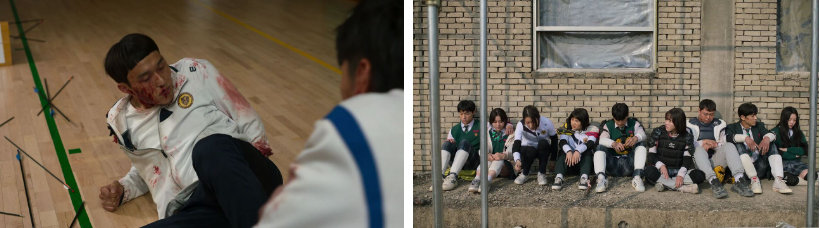 양궁부 연습실. 귀남한테 물린 민재가 호흡곤란을 일으키며 뒷걸음질 치는데.. 따라서 다가가는 귀남이 이제 청산이 어딨는지 기억나냐고 물어요. 농구부 연습실 쪽으로 뛰어가다가 자기 혼자 무리에서 이탈했다고 하면서 어디로 갔는지 확실히 모른다며 제대로 발음도 못하는 민재를 귀남은 목에 활을 꽂은 후 다시 확 빼버리고.. 민재의 몸이 막 사정없이 꺾이죠. ㅠ 공사장. 미진은 이젠 여기에 갇혔다며 짜증을 내고..대수는 조용히 하라고 투덜. 날이 서 있는 둘을 말리는 우진이..여기서 살아남아도 그게 사는거겠냐고 울먹이는데.. 너희들이 고3의 고통을 아냐며 꼭 살아남아서 고3 돼보라는 미진. 그리고 어이없는 2학년 아이들. 한숨을 쉰 하리가 울다 지친 온조한테 아빠는 우리를 구하다 사망하신 거라면서 잊지 않고 살아가겠다고 합니다. 그리곤 하리는 미진과 뛰어내릴 데 있는 찾아보러 일어나죠. 그대로 앉아있는 2학년 아이들..온조가 가만히 말해요. 앞으로 희생하는 사람이 없었으면 좋겠다고요. 누구 덕분에 살아가는거 힘들다면서...해줄 수 있는 게 없다고..죽고 싶은데 죽지도 못하겠고 살아갈 자신도 없다는 온조한테 청산은..다음에 천천히 얘기하기로 하자고 온조를 가만히 쳐다봅니다.