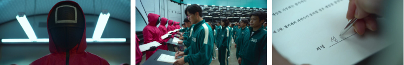당신들을 어떻게 믿냐, 왜 얼굴 공개를 안하고 그런 가면을 쓰고 있냐는 등.. 상우를 비롯해 몇명이 의문을 제기하자..가면을 쓰고 있는 것은 여기 규칙이고.. 벽에걸린 화면에.. 그 사람들이 공유와 딱지치기 하는 모습을 보여주면서.. 공유가 기훈한테 그랬던 것처럼.. 그 사람들의 신상과 현재 처한 상황을 말하면서.. 자기들은 이 게임을 강요하지 않지만 여기 모인 사람들은 밖에서 채무로 시달리다가 자발적으로 들어 온 것으로 알고 있다면서.. 밖에서 시달리든.. 여기서 한 번 게임을 해보든.. 선택이라고.. 게임에 참가를 원하면.. 참가동의서에 싸인을 하라고 하죠. 기훈이.. 상금은 얼마고 이기면 얼마를 받냐는 등 상금에 대해 묻자... 천장에서 투명한 큰 돼지저금통이 하나 매달리게 됩니다. 456명 앞으로 각각 1억원이 책정 돼 있고, 탈락하면 그 사람들 몫의 1억원은 저기로 일단 모아져서 6개의 게임을 모두 통과한 사람들이 가져갈 것이라고..그리고 참석자들이 게임을 원하지 않으면 세번째 규칙처럼..한 푼 못받고 여기서 나가게 되고, 저 돈들은 탈락자의 식구들한테 돌아간다고... 서로 눈치를 보면서 ...456명 전원 동의서에 싸인을 합니다.