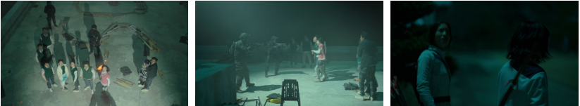임시보호소 여기저기에 마음이 적힌 노란색 리본이 달아져 있고.. 질서 있게 행동하는 사람들과.. 점점 안정되고 있는 듯한 여러 모습들이.. 시간이 많이 경과 되었음을 보여주고.. TV에서는 계엄이 선포된 지 3개월 17일째라며 계엄령 해제와 효산시 폭격으로 청문회가 무기한 연기됐다는 뉴스, 바이러스의 실체를 못 밝히고 있다는 질병관리청은 잠복기를 알 수 없다고 하고. 추가감염 우려로 효산시민에 대한 격리는 지속되고 있다는 뉴스, 그런 효산 시민들한테 전국적으로 구호물품이 쏟아지고 있다는 뉴스가 흘러나오고 있죠. 그렇게 효산시에 대한 격리는 계속되면서 시간이 지나고 효산시 전체가 격리소처럼 되고..아이들도 뭉쳐있지 않고 각자 움직이는 상황이죠.