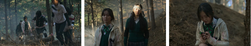 양궁부 아이들.. 준성을 묶은 카트를 세 명이서 끌고 어디론가 가고 있는데.. 준성은 자기를 끝까지 버리지 않는 아이들한테 고마움을 표합니다. 좀비들 신경쓰느라 정신없으니깐 말 시키지 말라는 미진..ㅋ 하리는 뒷산쪽으로 우르르 달려가는 아이들을 보고 저쪽으로 가자고 합니다. 청산모를 비롯해서 다른 좀비들을 따돌리고 가까스로 뒷산으로 뛰어가는 아이들.. 효령이 넘어지고 앞서 달려가는 지민을 부르지만.. 효령한테 오는 듯 하다가 입구 반대쪽에서 달려오는 좀비들을 보고 뒷걸음질 쳐서 도망가버려요. 넘어진 효령을 우진이 발견하고 손잡고 뛰는데 뭔가에 걸려 둘이 넘어지고 괴성을 지르며 뒤따라오는 좀비들이 덮치려는 순간 꺼억~하는 소리와 함께 등에 화살이 꽂혀 좀비들이 쓰러집니다. 쓰러지는 좀비 뒤로 활을 들고 있는 누나 하리를 본 우진은 뛰어가서..경기장에 있어야지 누나가 왜 학교에 있냐고 눈이 휘둥그레 ㅎ 동생을 본 하리도 반갑지만..일단 도망가자며.. 맨 뒤에서 화살을 쏘면서 뛰어가죠. 이 과정에서 양궁부 후매 민재도 무리를 이탈하게 되죠. 효령을 구하지 못한 지민은 좀비들을 피해 무작정 뛰며 울며 헤매고 학교운동장으로 가서 좀비들한테 물려버리죠.