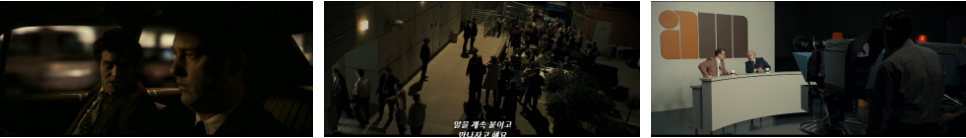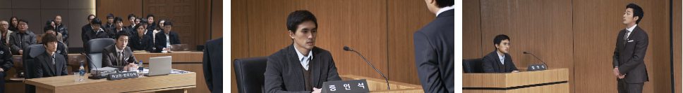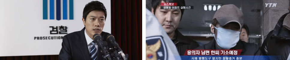 검사로서 많은 기자와 카메라 앞에서 사건 브리핑을 하고 있는 안민호 검사(박희순). 안검사는..후배들의 존경을 한 몸에 받고 있는 대학교수 아빠의 그늘에서 벗어나 자신의 능력으로 인정 받고 싶어하는 자존심이 강한 인물로 나옵니다. 강성희(하정우) 와는 선후배 사이이구요. 강성희 역시 검사였지만 강압적인 수사방식이 사람들 사이에서 구설수에 오르자 검사를 그만 두고 변호사 사무실을 오픈 한 상황. 껄렁껄렁 하면서 법정에서의 승소와 돈만 밝히는 듯 보이지만 나름 정의로운 변호사이죠. 암튼. 안검사의 브리핑과 피해자 남편 누구누구가 오늘 체포 돼 기소될 예정이라고 말하는 기자의 모습이 TV를 통해 중계되고 있구요~~.