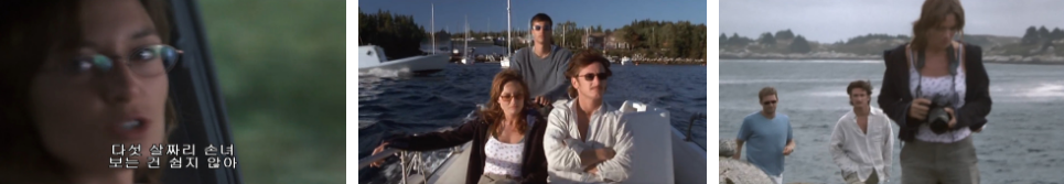 서로 웃으면서 이야기도 하고 요트 끄트머리에 앉아 갈매기한테 쿠키도 던져주고.. 사진도 찍는 등 재밌는 시간을 보내면서 섬으로 향하고.. 섬에 거의 다 와서 사진작가 진이 나레이션으로 이런 말을 합니다. " 그땐 우리에게 고작 17시간이 남았다는 걸 몰랐다.. 12시간..아니..3시간? " ... 섬에 먼저 내린 진은 여기저기 사진을 찍고.. 시동생 여친인 애덜라인이 사건이 기록된 책을 들고 "두 여자는 목이 졸리고 도끼로 찍힌 채 부엌에서 발견됐다..피해자 중 한 명인 아넷은 흰 망사천으로 덮인 채 발견이 됐는데..마치 살인범이 차 마시는 동안 안 보려고 했던 것처럼 말이다.." 라고..읽고선 신났다는 듯 웃어대죠. 나머지 세 명이 .. 100년 전 사건에 대해 장난식으로 얘기를 하고 있는 사이 진은 사진을 찍으며 진지하게 사건 현장에 대해서 상상을 하고 있죠. 진의 남편 토마스가.. 바위에 앉아 일렁이는 파도를 바라보고 있자.. 동생이 다가 와서.. 애덜라인이 형의 시를 듣고 싶어 한다며 우리는 비평가가 아니니깐 편하게 생각해 주라고 하자.. 토마스가 애덜라인을 보니.. 시 이상의 관심을 담은 요염한 미소를 보내고 있습니다. ㅎ 그들이 그러는 사이 진은.. 100년 전 사건때 생존자이자 목격자 마렌이 범인으로 부터 피해 도망쳤다는 동굴을 들어가서 마렌의 심정이 되어보죠.