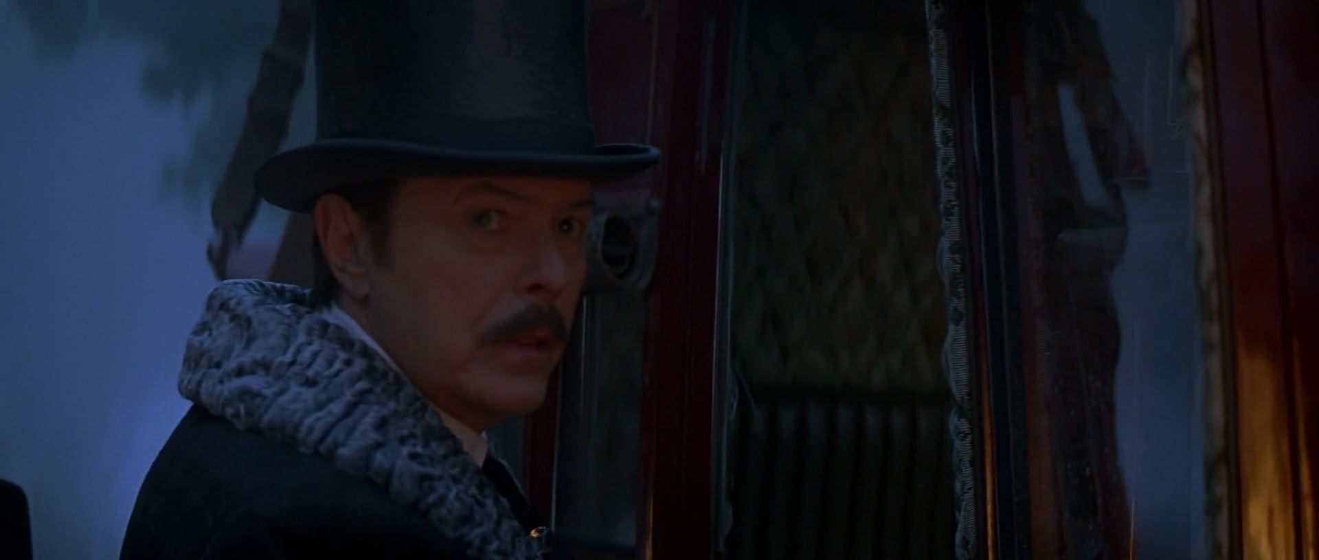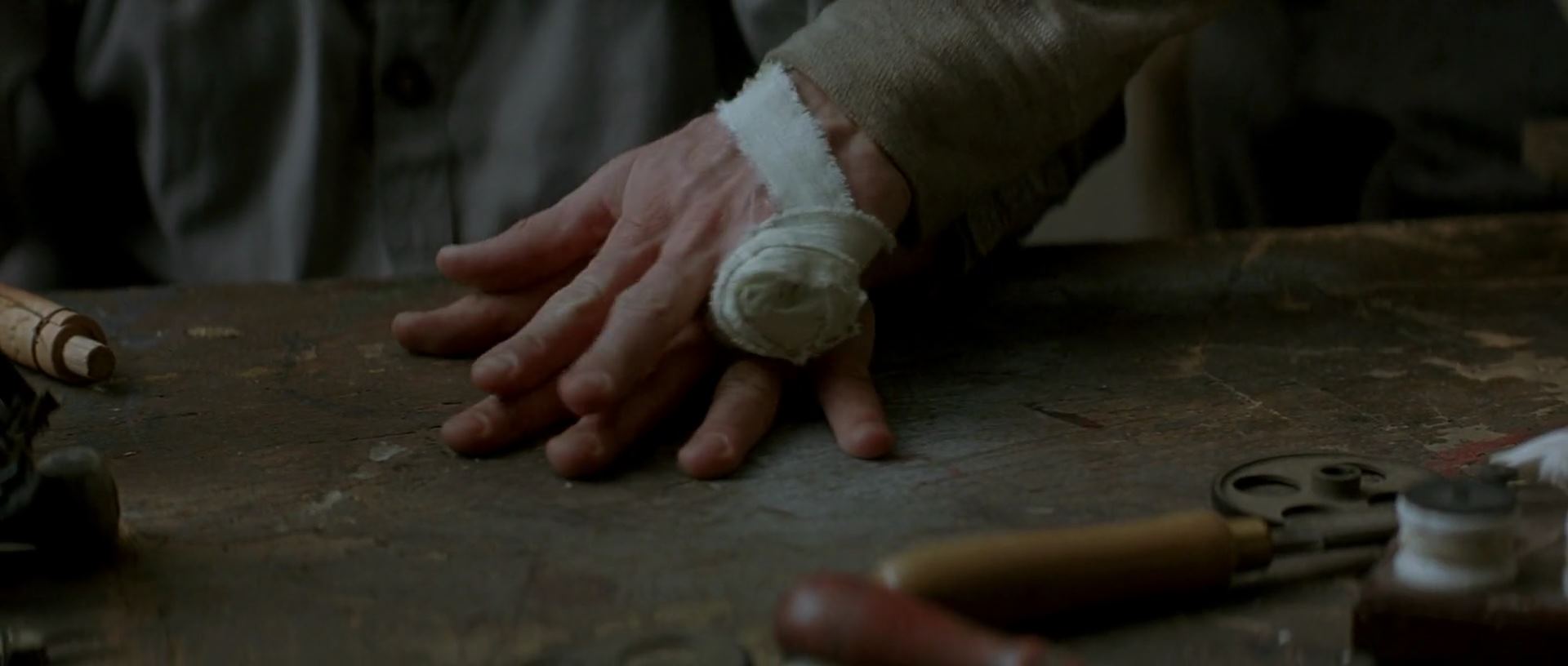 한편, 원래 신분인 '콜드로 경' 으로 살아가기 위해 마술사의 삶을 정리하고 있던 앤지어와 그를 돕는 커터. 예전 커터가 앤지어의 와이프가 죽었을 때 앤지어를 위로해준다고 어떤 익사 할 뻔한 선원이야기를 해 준 적이 있어요. 그 선원이 고향처럼 편안함을 느꼈다 하더라면서요....근데 다시 그걸 언급하면서 커터가 말하죠. 그거 거짓말이었다고.. 그 선원은 엄청 고통스러웠다 했었다고요.. 착잡하고 씁쓸한 표정의 앤지어를 두고..커터는 냉정하게 가버립니다. 혼자 멍하니 있다가 다시 물건을 정리하는데...뭔가가 자기쪽으로 굴러오는 게 보이고 잡아 들어 올리니..빨간 마술 공~!! 보든이 사형대에 올라가 손과 발이 묶이고 몸이 줄에 걸리는 순간, 앤지어가 누군가한테 총을 한 방 맞습니다. 뚜벅뚜벅 걸어오는 사람은 바로...보든!!