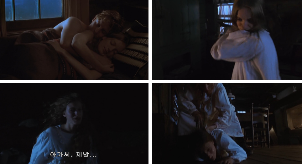 100년 전, 사건 당일. 경악스런 표정으로 카렌이 등장하고..추워서 아넷과 붙어서 잤다는 마렌의 말에.. 자기가 바본 줄 아냐며 그래서 잠옷도 벗었냐고 카렌은 말하죠. 왜 그러냐고, 무슨 일이냐며 아넷이 말하자.. 마렌의 만류에도 불구하고 카렌은.. 너의 남편 이반, 그러니깐 자기 친오빠하고 마렌은 잠자리를 가졌었다며.. 속죄하라는 뜻으로 결혼시켜 미국으로 보냈더니 그 버릇이 아직 그대로라고 하자.. 아넷은 놀라 마렌을 쳐다보고. 자기도 이반을 사랑했다는 마렌. 카렌이 그건 사랑이 아니라 병이라고 소리치자 더 이상 카렌의 말을 못 들어주겠다는 듯 이성을 잃은 마렌이 침대에서 내려와 옆에 있는 의자를 거꾸로 들고 부서질 때까지 언니 카렌을 내려칩니다. 쓰러진 언니를 질질 끌고 밖으로 나가 긴 빗자루를 빗장삼아 방문을 걸어잠그고 한치의 망설임도 없이 창고에서 도끼를 들고와 내려치려는 순간 쨍~하며 뭔가 깨지는 소리가 들려 밖으로 나가보니 아넷이 창문을 깨고 도망치고 있죠. 도망가는 아넷의 뒷모습을 보며 마렌이 침착하게 두 번 정도 부르자 아넷은 멈춰서서 마렌을 향해 제발 살려달라고 울면서 빌어요. 이제 더이상 물러설 수도 없는 노릇인 마렌이.. 당신이 모르길 바랬었는데 정말 미안하다고 하며 도끼를 휘두릅니다. 아넷을 질질 끌고 들어 와 부엌 바닥에 옮겨 놓은 후.. 아직 목숨이 붙어 있어 기어 가려고 손을 뻗는 언니를 보고 끈을 가져와 언니의 목을 졸라 죽여버리죠.