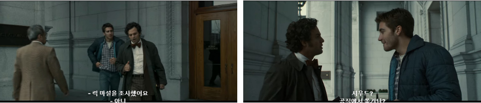 다음 날 일찍 만나서.. 함께 아침식사를 하고 있는 로버트와 데이브가 어제 새벽에 나눈 대화를 이어갑니다. 데이브가 .. 자기가 그렇게 수사를 오래 했는데도 불구하고 물증도 없었고 셔우드 말이 필체가 맞지 않다고 했었다며 어쩔 수 없었다는 식으로 말하자.. 로버트는 폴 기자처럼 술만 퍼마셔대는 셔우드 말하는거냐고 데이브 말문을 막죠. ㅋ 셔우드 제자 테리라는 사람은 필체 맞을거라는 의견을 내지 않았었냐는 로버트한테 다시 데이브는 ..셔우드가 담당이었고.. 문서증거 책임자였다며.. 기소해서 재판을 했더라도 이기지 못했을거라고 말을 해주죠. 증거가 왜 없냐며 ..조디악 시계며 군화, 같은 사이즈 신발..장갑.. 피 묻은 칼.. 성탄절 철자(~ss) 며 그리고.. 아동성추행자라는 전적 이런 것들은 다 뭐냐고 로버트가 답답해 하자.. 다 정황 증거들 뿐이라고 일축시키는 데이브!! 로버트가 다시 어떤 종이를 건네주며.. 아서 리 앨런이.. 자기가 일하는 정유소에서 경찰들과 면담 후(그 때.. 뮬라넥스, 데이브, 암스트롱과의 면담 ㅎ) 지내는 트레일러를 싹 다 청소한 후.. 48시간 후에.. 산타로사로 거처를 옮겼었다고 말하죠. 데이브는 수사담당이었던 본인보다 새롭고 더 많은 것을 알고 있는 로버트 말들에..점점 할 말이 없어져 가고 눈만 끔벅거리면서 설명을 듣고 있죠 ㅋ