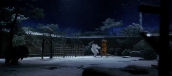 녹엽정이라는 술집에서 부하들하고 술마시고 놀고 있는데... 키도가 찾아갑니다. 키도는 침착하게 오렌과 그 부하들의 동태를 살핀 뒤, 화장실에서 노란색에 검은 줄무늬 츄리닝으로 갈아입고 있는데 오렌의 심복인 소피가 화장실로 들어오자...소피를 끌고 나와 오렌의 이름을 불러 나오게 한 뒤 오렌이 보는 앞에서 소피의 팔을 칼로 자르며 결투의 신호탄을 울리죠. 손님들은 다 도망가고 오렌과 부하들만 남아있는 상황. 오렌의 최측근 부하들부터 한 명, 두 명... 키도의 칼에 나가 떨어지고.. 2층에 있는 오렌과 1층 키도가 마주보고 있는데..어디선가 오토바이 소리가 나더니 검은양복차림의 남자들이 우르르르~크레이지88 등장. ㅋ 오렌은 본인의 단도를 나무난간에 꽂아버리고 사라져요. 오렌이 사라지자 마음이 급해진 키도는 빠른 속도로...그 많은 수를 다 한 칼로 제압해 버리고 (대부분 흑백처리 ㅎ) 나무 난간위에 올라 선 키도가 '목숨이 붙어있는 것들은 가라'면서 ㅎ 소피한테는 넌 거기서 딱 기다리고 있어라고 한 뒤.. 오렌이 사라진 쪽으로 가...미닫이 문을 확 여는데....까만 밤하늘에서 눈이 살포시 내리고 있는 눈 덮인 일본식 정원. 눈처럼 하얀 기모노를 입은 오렌이 칼을 들고 기다리고 있죠.