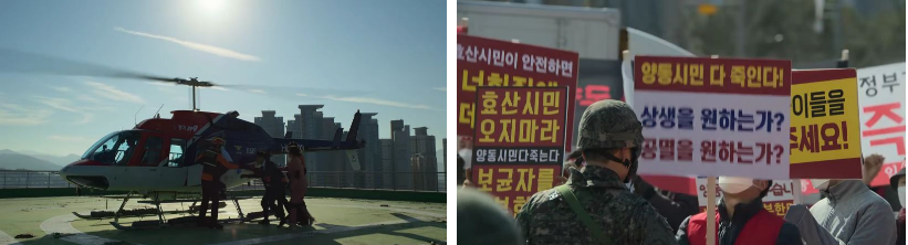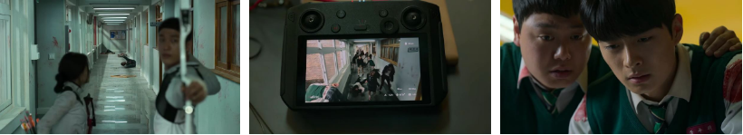 옥상. 철수는 군인들한테 혼자 구조가 되고..다른 생존자는 없냐는 질문에 끝까지 없다고 해버리죠. 철문을 사이에 두고 좀비들로 아우성인 옥상밖 다시 만난 청산과 귀남이 대치하고 있어요. 청산이 음악실에서부터 챙겨온 악보거치대로 사정없이 귀남한테 휘두르지만 끄덕도 않는 귀남은 눈X 내 놓으라며 청산의 한 쪽 눈을 찌르려는 순간 평소와는 뭔가 달라진 남라가 한 손으로 귀남의 목을 조르며 물어요.. "너 왜 안 죽었어??" 그리고는 고통스러워하는 귀남을 파란색 천막 천 아래 좀비들한테 던져버립니다. 놀란 다른 친구들과.. 자신의 오른 팔을 내려다보는 남라.. ㅎ 은지로 인해 불타는 교무실 천장 스프링클러가 작동되면서 건물 안 모든 잠금장치가 자동해제, 옥상문도 찰칵하면서 열리고..귀남이 잠깐 맥을 못 추는 사이 친구들이 옥상으로 들어와 문을 잠궈버리고.. 철수를 태워 막 이륙하고 있는 헬기를 미친듯이 손을 흔들면서 불러보는데.. 철수 혼자 곁눈질로 옥상의 친구들을 바라보고 있지만.. 헬기가 방향을 틀자 싸늘한 표정으로 시선을 거둬버리죠.
