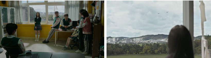 임시보호소 여기저기에 마음이 적힌 노란색 리본이 달아져 있고.. 질서 있게 행동하는 사람들과.. 점점 안정되고 있는 듯한 여러 모습들이.. 시간이 많이 경과 되었음을 보여주고.. TV에서는 계엄이 선포된 지 3개월 17일째라며 계엄령 해제와 효산시 폭격으로 청문회가 무기한 연기됐다는 뉴스, 바이러스의 실체를 못 밝히고 있다는 질병관리청은 잠복기를 알 수 없다고 하고. 추가감염 우려로 효산시민에 대한 격리는 지속되고 있다는 뉴스, 그런 효산 시민들한테 전국적으로 구호물품이 쏟아지고 있다는 뉴스가 흘러나오고 있죠. 그렇게 효산시에 대한 격리는 계속되면서 시간이 지나고 효산시 전체가 격리소처럼 되고..아이들도 뭉쳐있지 않고 각자 움직이는 상황이죠.