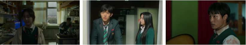 하지만 밤이 된 다음 화면.. 수혁이 기다리는 곳으로 간 온조 앞에 생존한 친구들이 총 집합해 있죠.. 난감한 수혁이 대수한테 너만 알라고 하지 않았냐고 째리고.. 하리옆으로 가만히 가서..조용조용한 목소리로 우리만의 비밀이랬는데 말하면 어떡하냐는 대수 ㅋ 하리는.. 자기 안 데리고 가면 경찰에 신고해 버린다고 했다며 시크하게 미진을 내려다 보죠. 담뱃불을 비벼 끄고 일어난 미진이..알아봤더니 좀비특별전형 안된다더라며.. 한숨을 쉬죠. ㅎ 다 갈거냐고 묻는 온조한테.. 하리는.. 너만 빚지고 사는거 아니고 다들 너처럼 아프다고 하면서..혼자 있는다고 덜 아픈 것도 아니니 같이 가자고 걸음을 떼죠.그 뒤로 차례로 아이들이 따라가고.. 괜찮냐 묻는 온조의 물음에.. 효령은.. 자기도 갈거라고 미소를 짓죠. 벽을 넘어 뒷산으로 걸어가는 아이들은 리본이 묶인 나무 앞에 서서 각자 챙겨온 과자와 편지를 아래에 둡니다. 바스락거리는 뭔가를 꺼내는 대수...그게 뭐냐고 효령이 묻는데.. 자기 이거 못버렸다면서.. 초코바 껍질을 내려놓고는.. 준영이를 부르며 다음에 꼭 한 박스 사 가지고 온다고 울먹입니다. 아이들 순간 숙연해지고.. 돌아서는 하리가 학교건물 불빛을 발견해요.